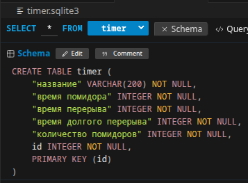PRAGMA foreign_keys = ON;— включает поддержку внешних ключей в SQLite (иначе они игнорируются);CREATE TABLE IF NOT EXISTS— создаёт таблицуtimer, только если её ещё нет (безопасно при повторном выполнении);title VARCHAR(200) NOT NULL— название таймера, до 200 символов, обязательно;pomodoro_time INTEGER NOT NULL— длительность одного помидоро в минутах;break_time INTEGER NOT NULL— длительность короткого перерыва;break_long_time INTEGER NOT NULL— длительность длинного перерыва;count_pomodoro INTEGER NOT NULL— количество помидоро в цикле до длинного перерыва;id INTEGER NOT NULL— уникальный идентификатор таймера;PRIMARY KEY (id)—idявляется первичным ключом (уникальный, индексированный);- Точка с запятой в конце — корректное завершение SQL-скрипта.