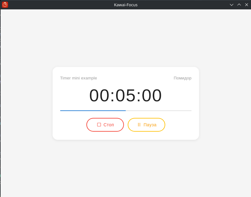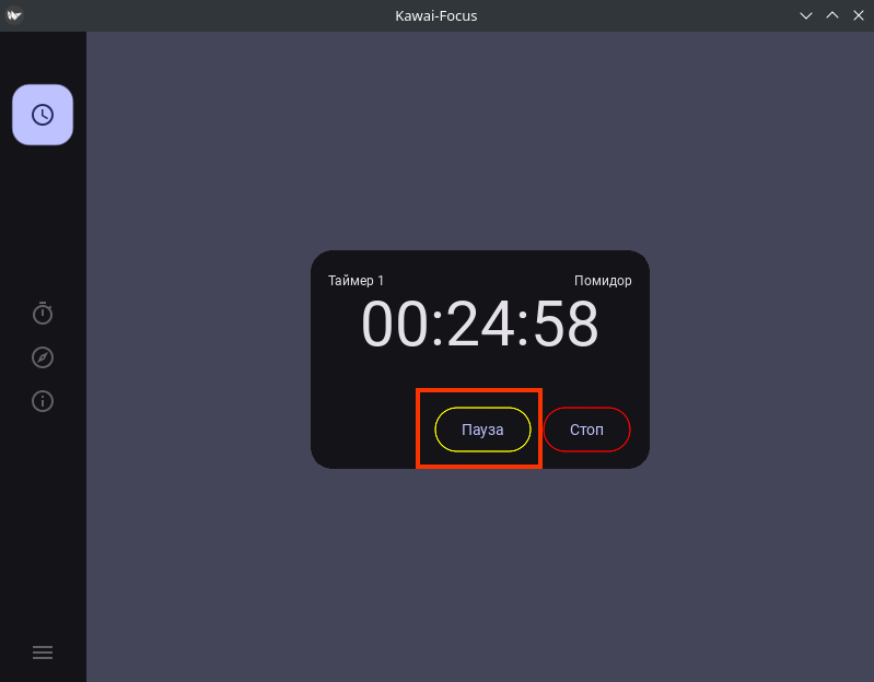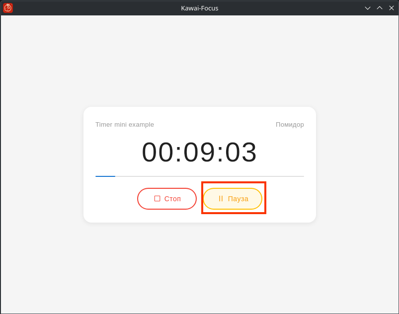 После запуска таймера видно, как начался обратный отсчёт и заполняется прогресс-бар. Также исчезла кнопка «Старт» и появились две кнопки: «Стоп» и «Пауза». Теперь нажму на кнопку «Пауза».