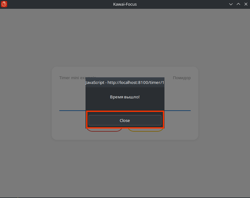 Что произойдёт после того, как прогресс-бар полностью заполнится, а время дойдёт до 00:00:00? Сейчас там используется функция alert в качестве заглушки, которая сообщает, что время вышло. После нажатия на «Close» таймер снова становится готов к запуску.