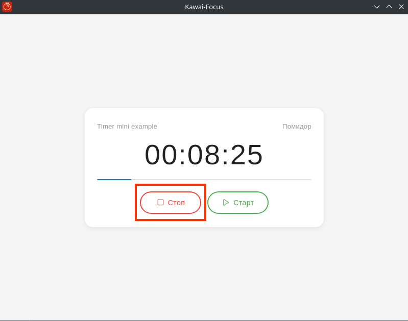 После нажатия на кнопку «Стоп» таймер вернулся в исходное состояние перед запуском. Его можно снова запустить, что я и сделаю для проверки работы прогресс-бара.