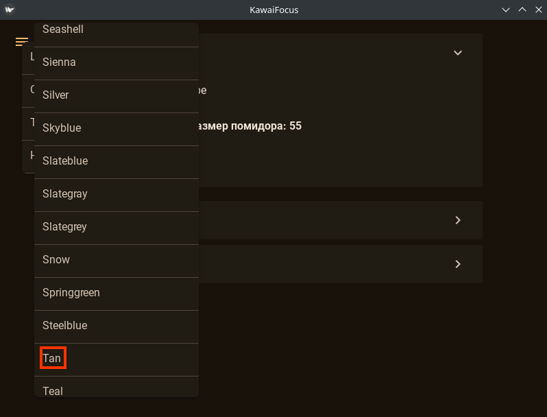 Прокручиваю меню вниз и выбираю цвет Tan, представляющий собой светло-коричневый оттенок. Все цвета темы сразу же изменяются. Мне нравится, что разработчики KivyMD 2.0.0 предоставляют такие широкие возможности для настройки внешнего вида приложения.