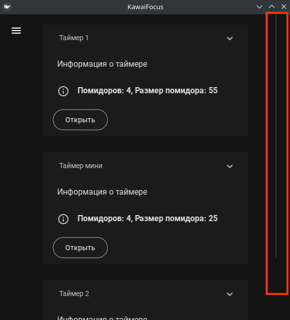 Теперь я решил проверить, как приложение выглядит в маленьком окне, а также работу полосы прокрутки. Для этого уменьшаю окно приложения и раскрываю все таймеры. Так как содержимое не помещается на экран, появляется возможность прокручивать его вверх и вниз.