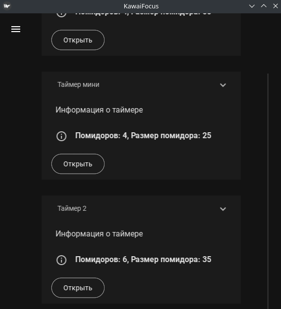 для списка таймеров. Он использует сворачиваемую и разворачиваемую панель, которая удобно скрывает описание таймера и его кнопки. В свёрнутом виде остаётся только название, что делает отображение списка более компактным. При желании сюда можно встроить кнопки для CRUD-операций — например, редактирование и удаление. Это позволит гибко управлять таймерами прямо из экрана «Таймеры». Меню я планирую сделать простым, в выпадающем стиле.