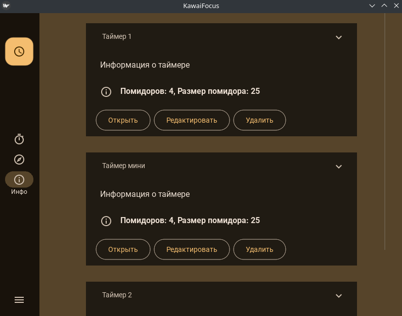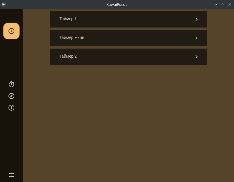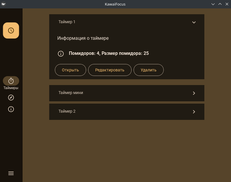 poetry run kawai-focusРаскрою «Таймер 1» и нажму на кнопку «Таймеры» с изображением секундомера: