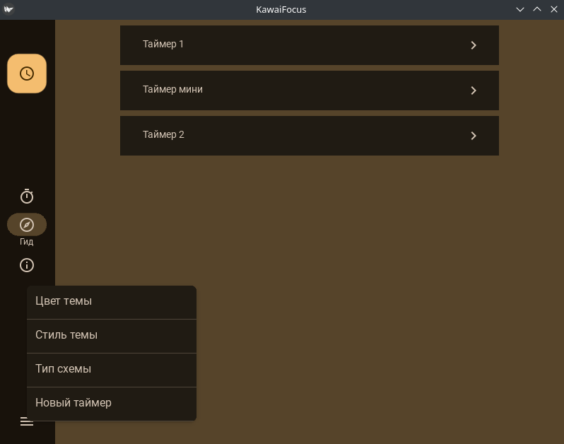 Кнопка «Гид» предназначена для будущего экрана, отвечающего за обучение пользователя работе с программой и техникой Pomodoro. Я хочу, чтобы моя программа была чем-то большим, чем просто набором таймеров. Для меня важно, чтобы каждый таймер приносил максимальную пользу пользователю.