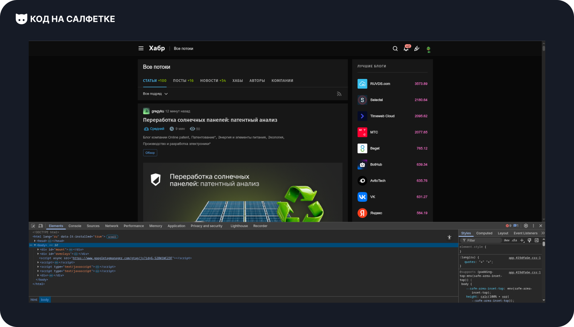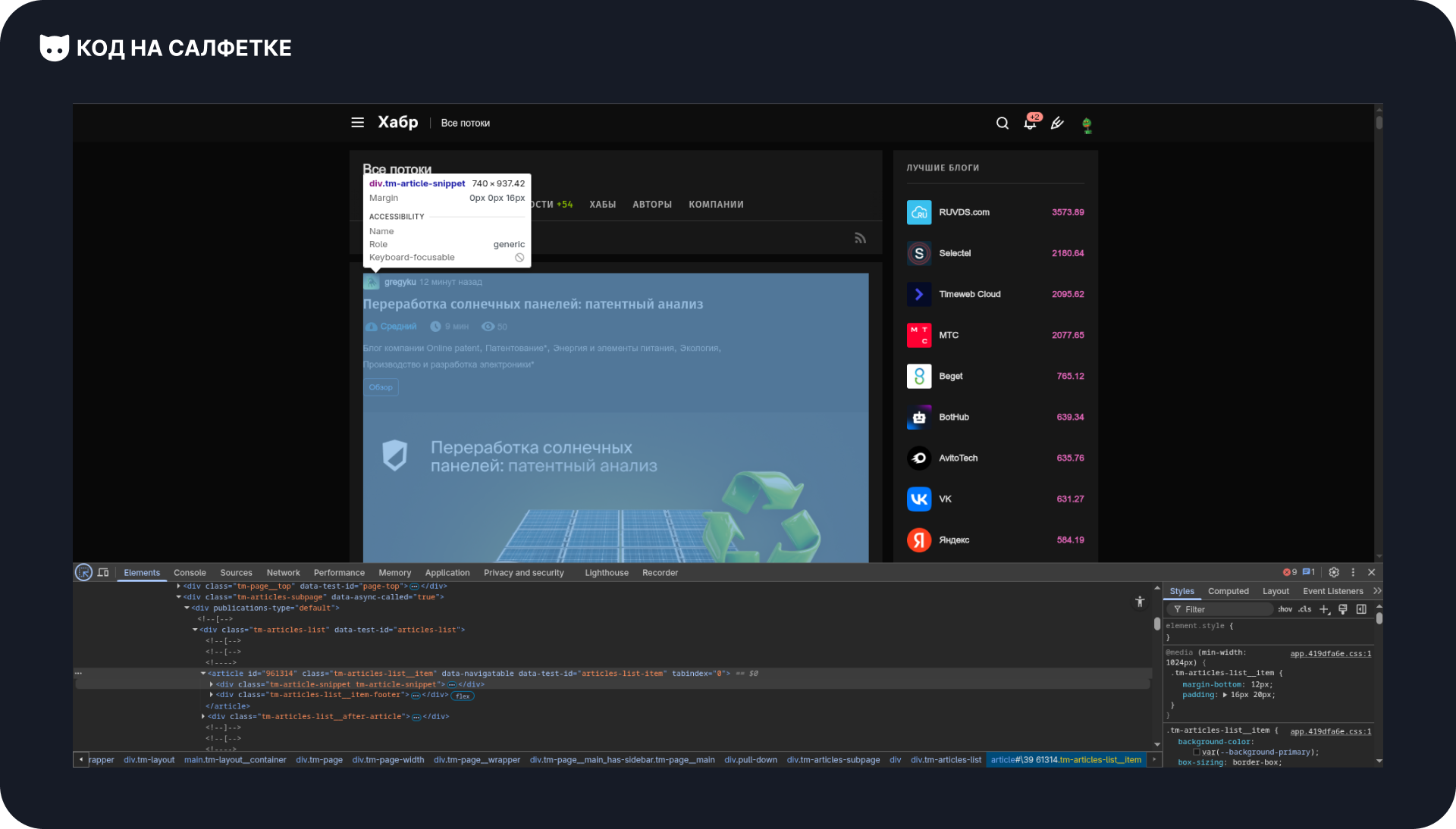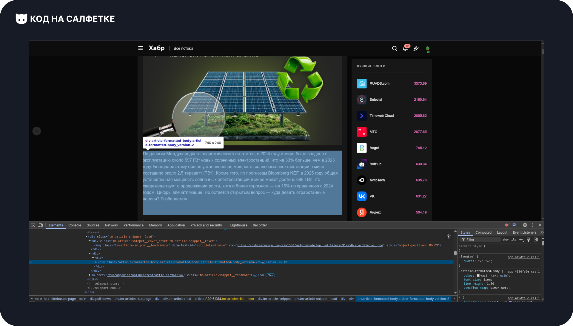 - В инструментах разработчика (DevTools) выделяем найденный элемент статьи.
