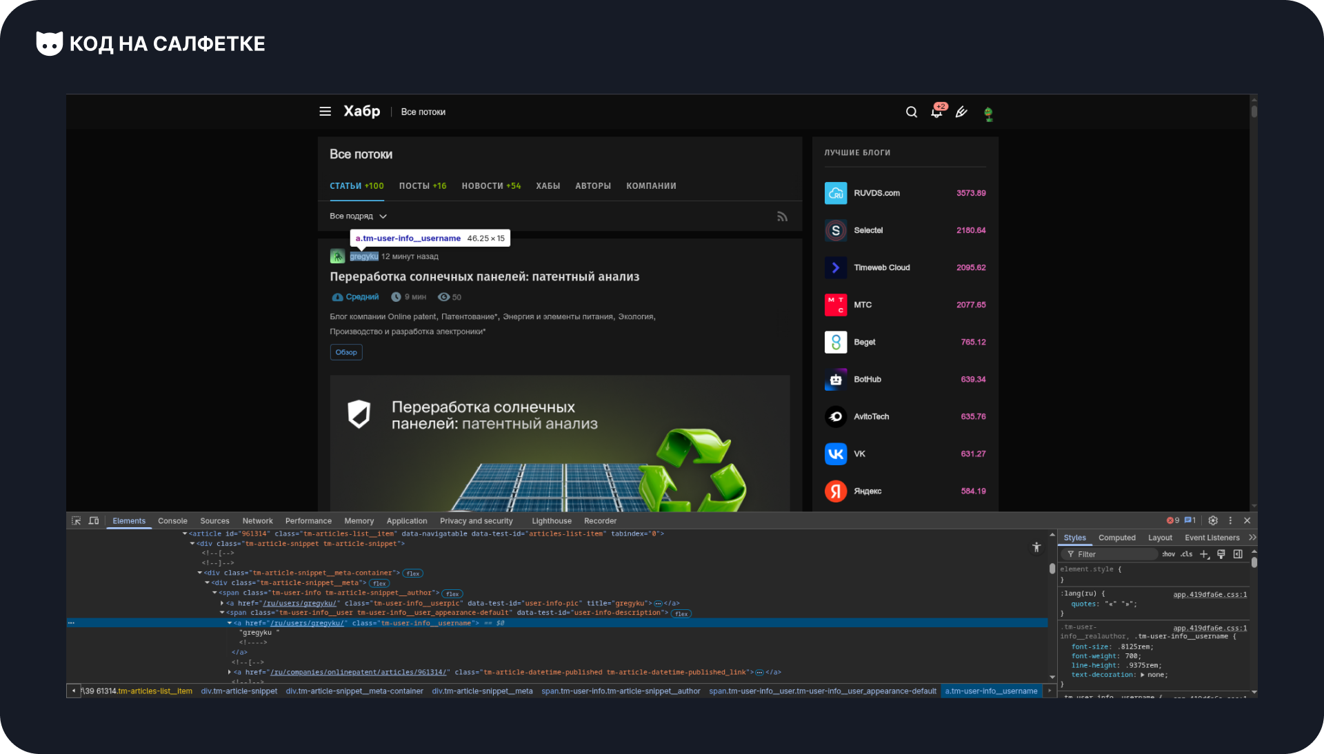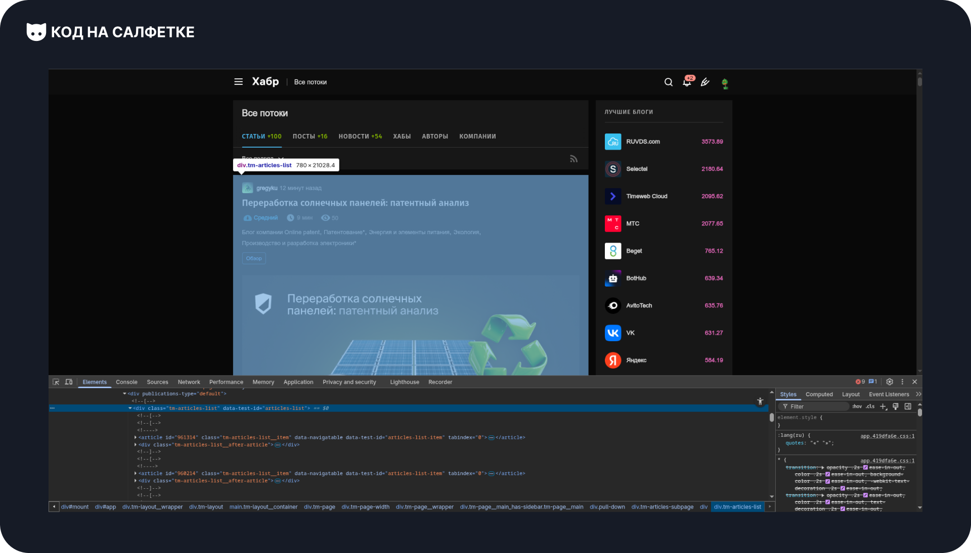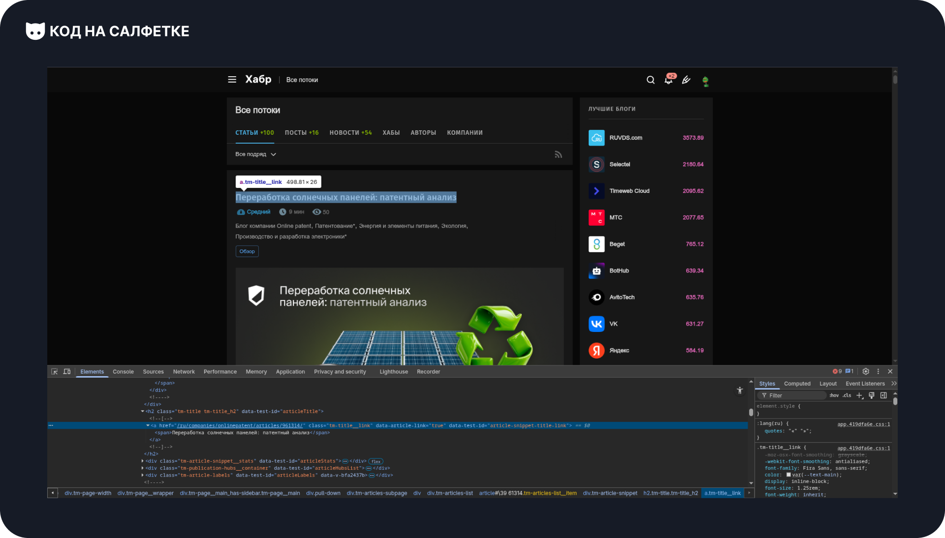 Таким образом, селектор для нашего элемента статьи выглядит так: .tm-article-snippet.tm-article-snippet.