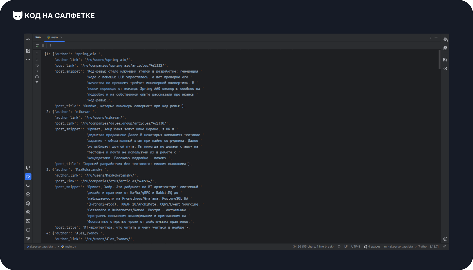pprint(parse_articles())Функция pprint выведет данные в удобочитаемом формате.