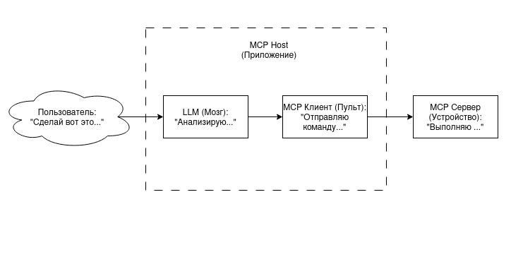- MCP Server («Устройство», например, Кондиционер). Обладает функциями («охладить»), но сам решений не принимает.
