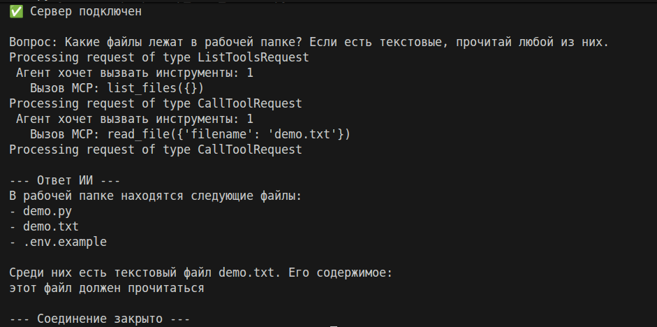 Для тестирования попробуем создать в директории проекта папку demo_files и поместить туда несколько файлов. Запускаем и наблюдаем MCP-магию: