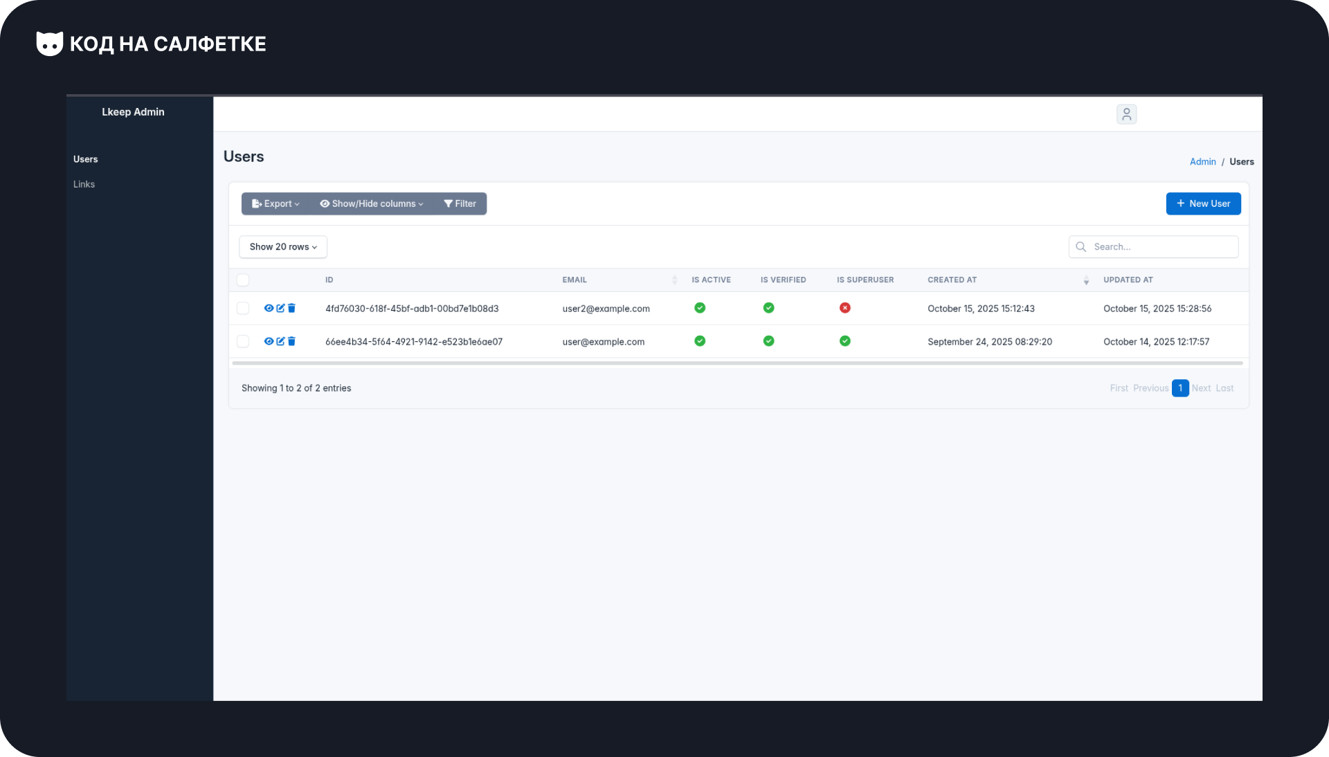 CRUDAdmin, с другой стороны, предлагает интересные возможности, но требует отдельной базы данных (например, SQLite) для хранения данных о администраторах. Такой подход не всегда удобен, особенно если хочется, чтобы админка была частью существующей системы авторизации и работала на тех же моделях пользователей, что и API.